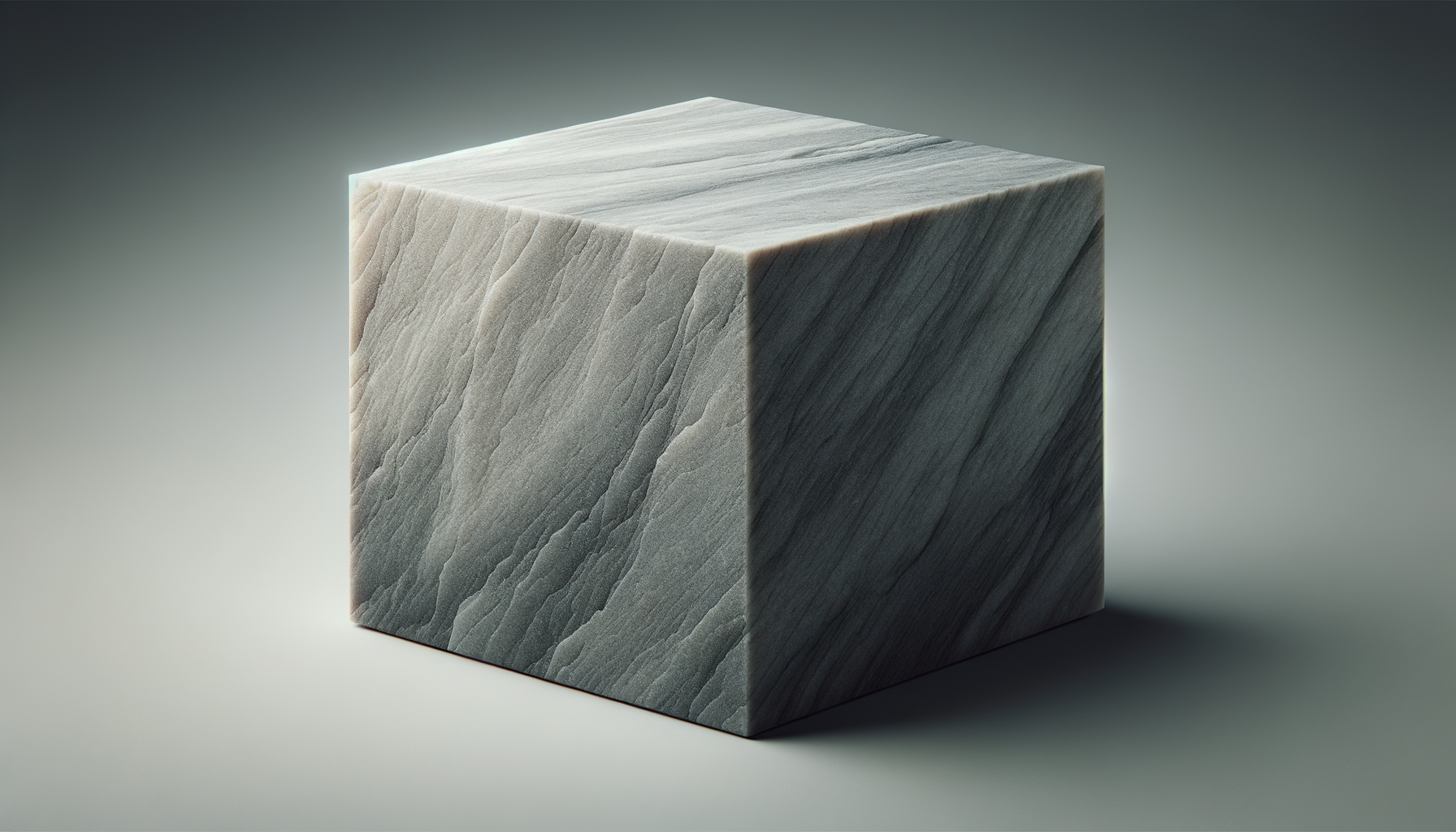A marble cube with a gray and white veined pattern on a neutral background.